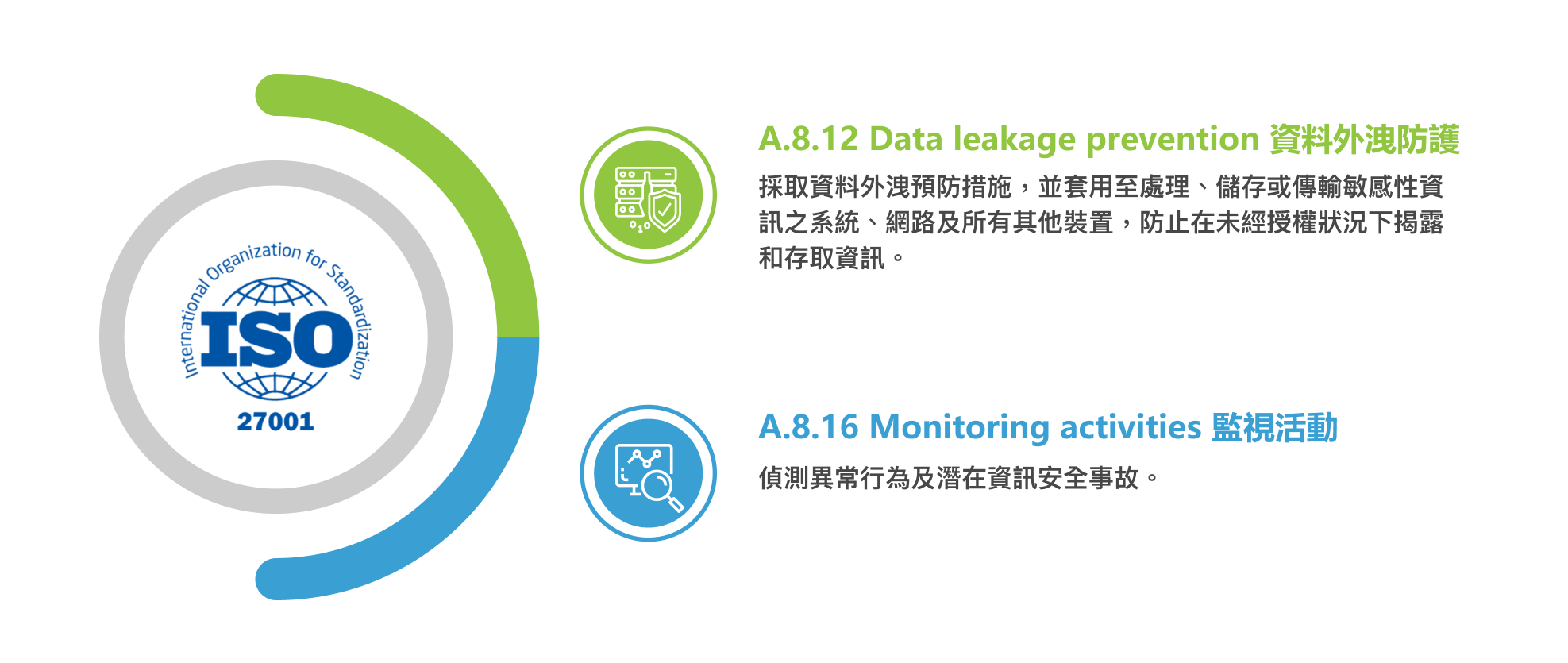 根據國際標準組織(ISO)公告第三版 ISO/IEC 27001:2022 資訊安全管理制度,針對資料外洩防護提出了相應的防範管制措施,希冀各機關在面對不斷演化的資料外洩風險時,強調以「資料保護」為中心,提升機關對資料外洩的防護能力。